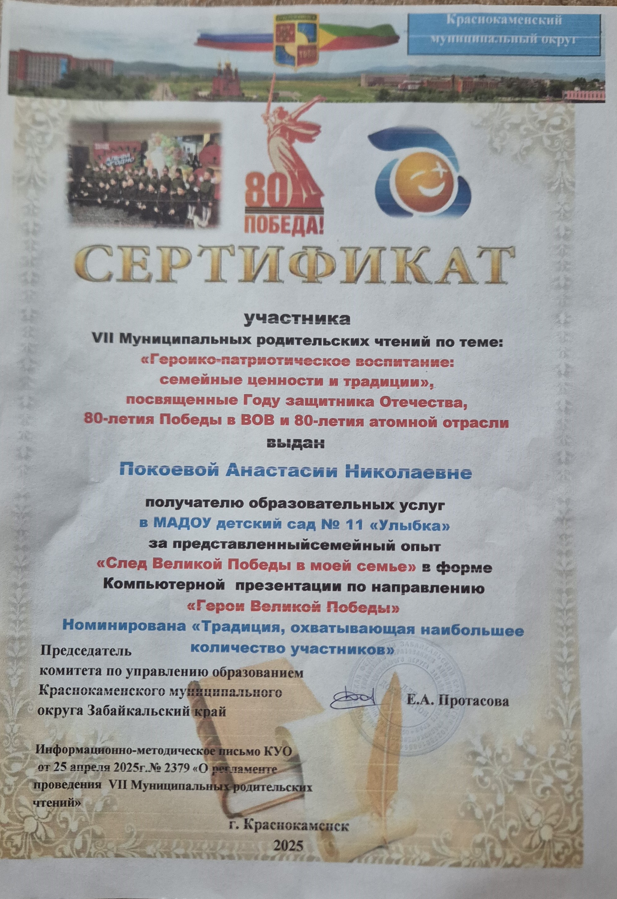 Сертификат участника VII Муниципальных родительских чтений по теме: "Героико - патриотическое воспитание: семейные ценности и традиции", посвященные Году защитника Отечества, 80- летия Победы в ВОв и 80- летия атомной отрасли. Номинация "традиция, охватывающая наибольшее количество участников"