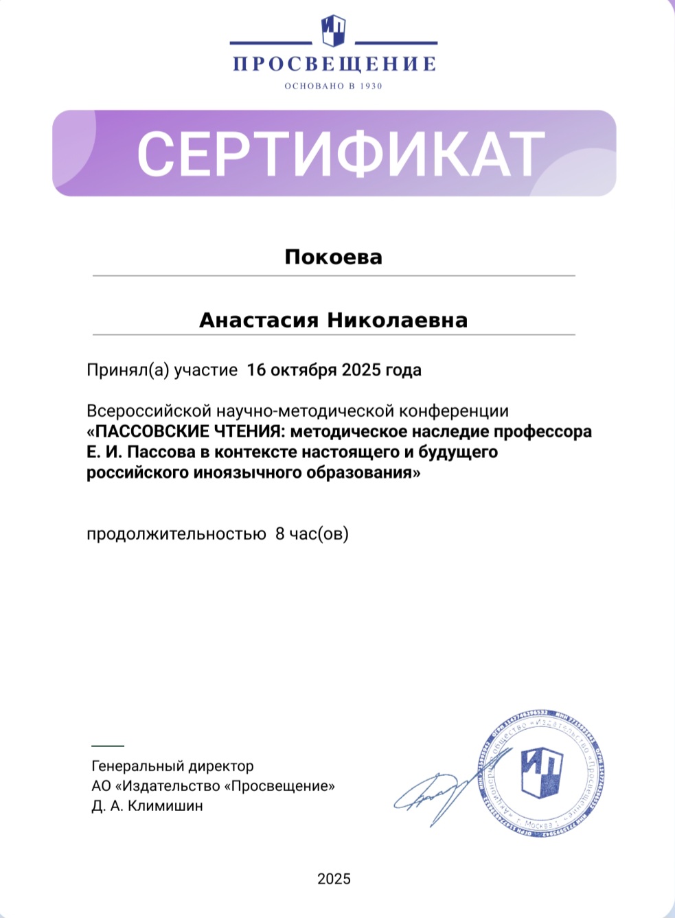 Всероссийская научно - практическая конференция "Пассовские чтения: методическое наследие профессора Е.И. Пассова в контексте настоящего и будущего российского иноязычного образования". 8 часов