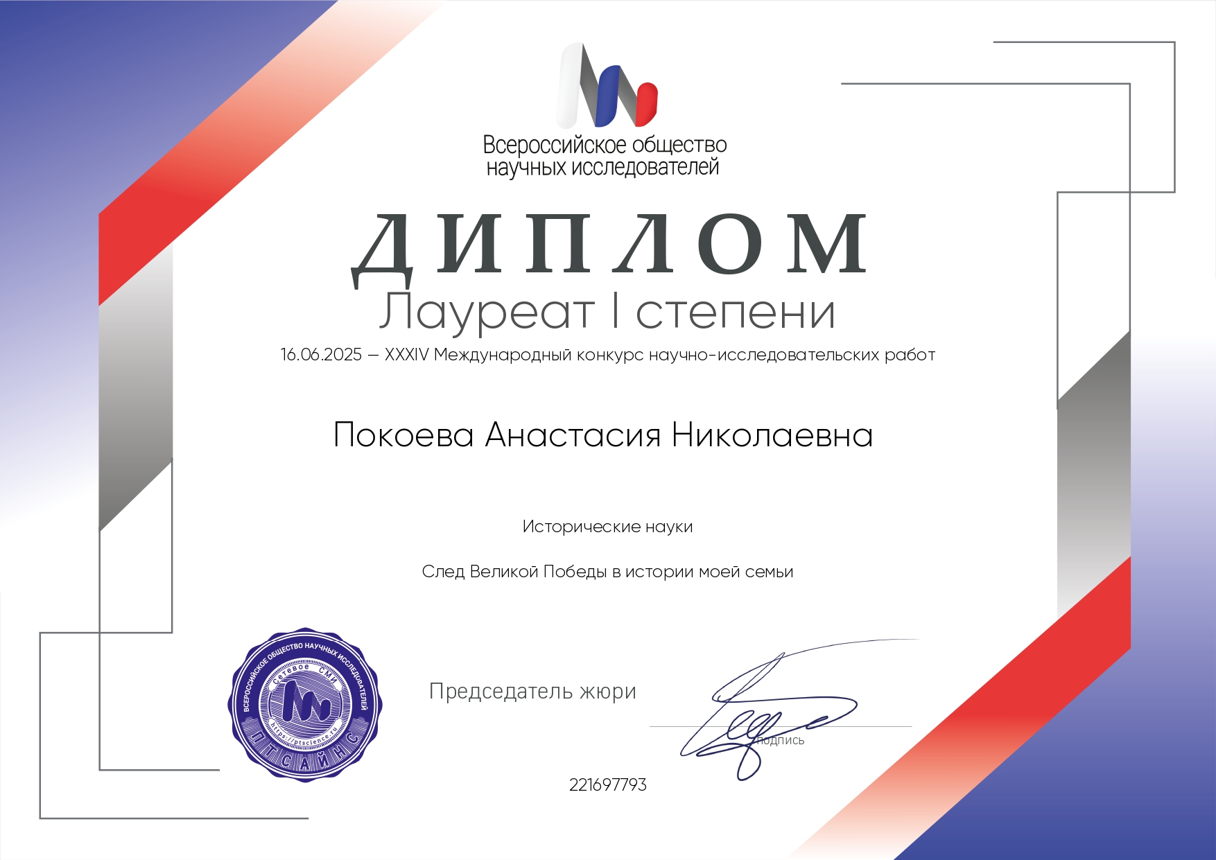 Диплом Лауреата I степени XXXIV Международный конкурс научно - исследовательских работ на тему: "След Великой победы в истории моей семьи"