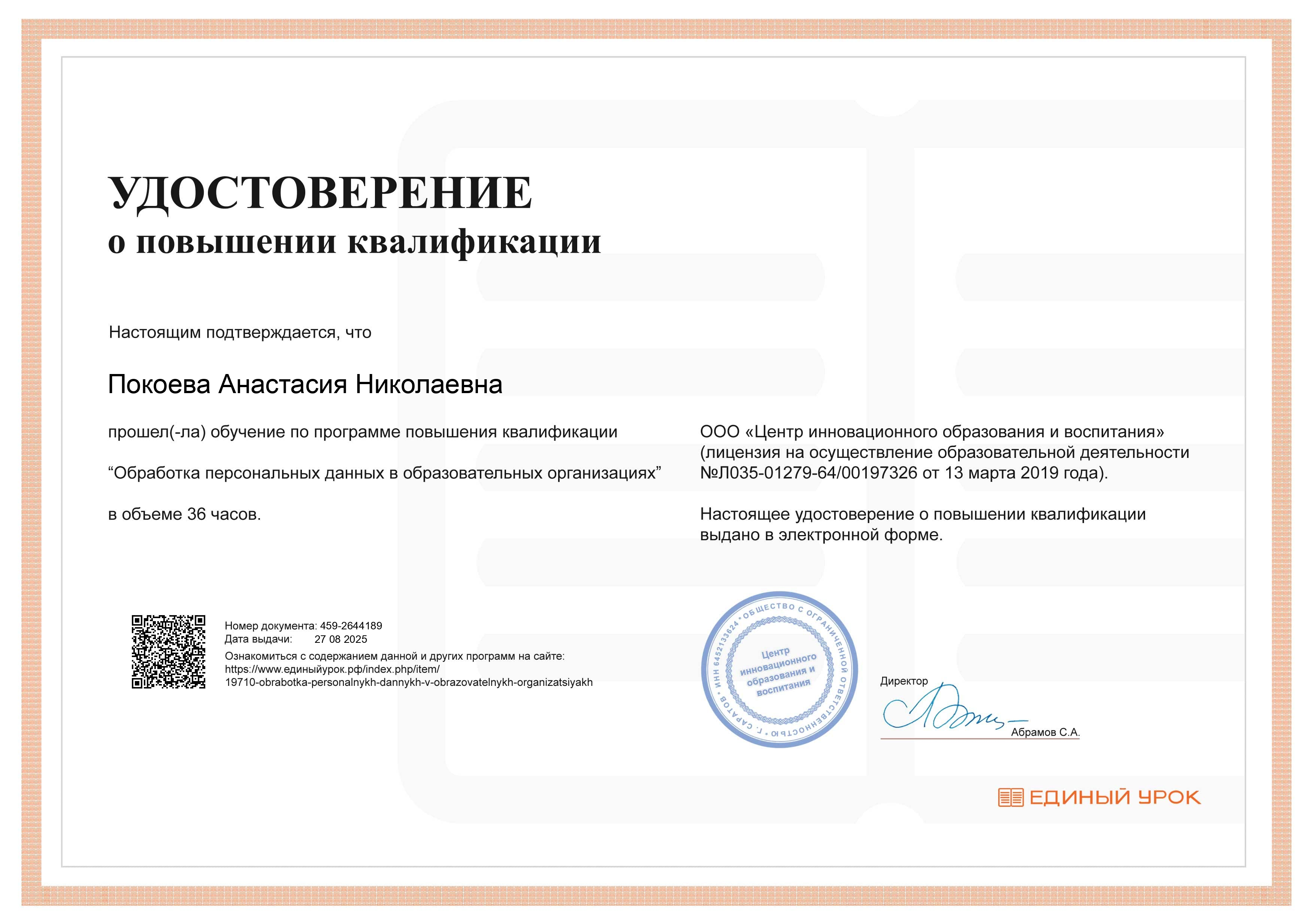Удостоверение о повышении квалификации. "Обработка персональных данных в образовательных организациях". 36 часов. 2025 г.