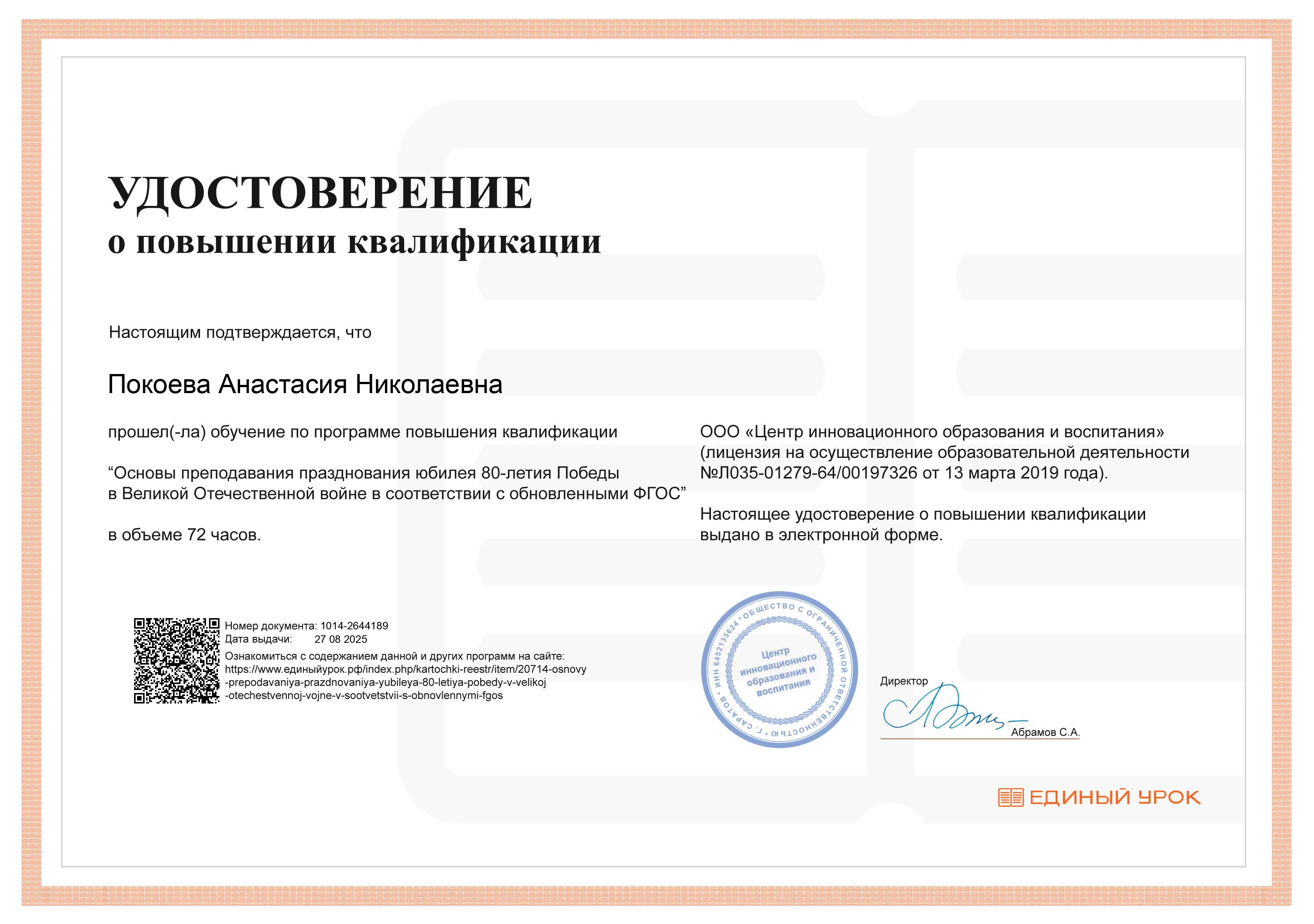 Удостоверение о повышении квалификации. "Основы преподавания празднования юбилея 80- летия Победы в Великой Отечественной войне в соответствии с обновленным ФГОС". 72 часа. 27.08.2025г.
